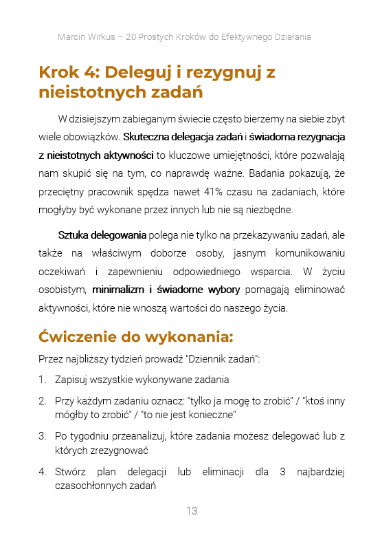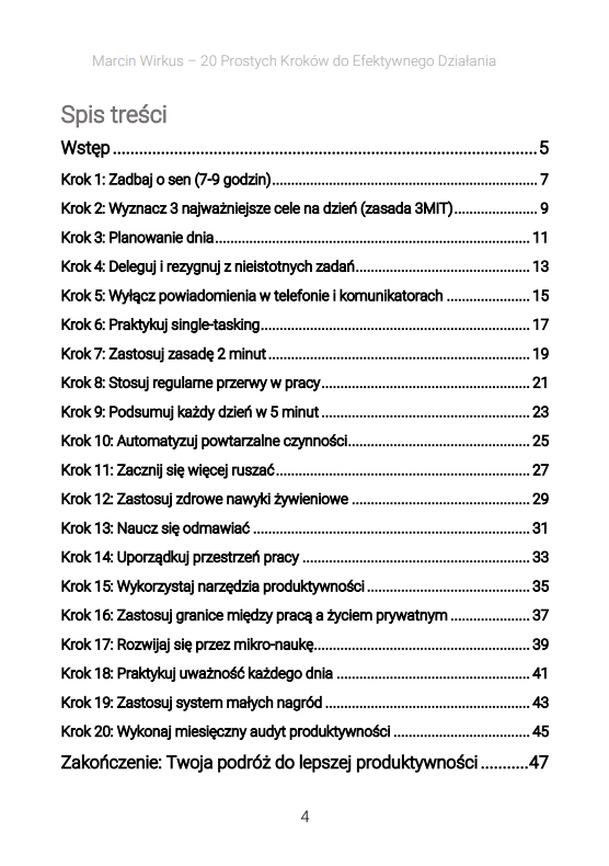 Ten ebook to nie kolejny teoretyczny poradnik. To praktyczny przewodnik po 20 sprawdzonych krokach, które systematycznie wprowadzane w życie, prowadzą do realnej zmiany. Każdy krok został starannie wyselekcjonowany i uszeregowany tak, aby budować solidny fundament produktywności – od podstawowych nawyków związanych ze snem i planowaniem, przez konkretne techniki pracy, aż po metody utrzymania długoterminowej motywacji.